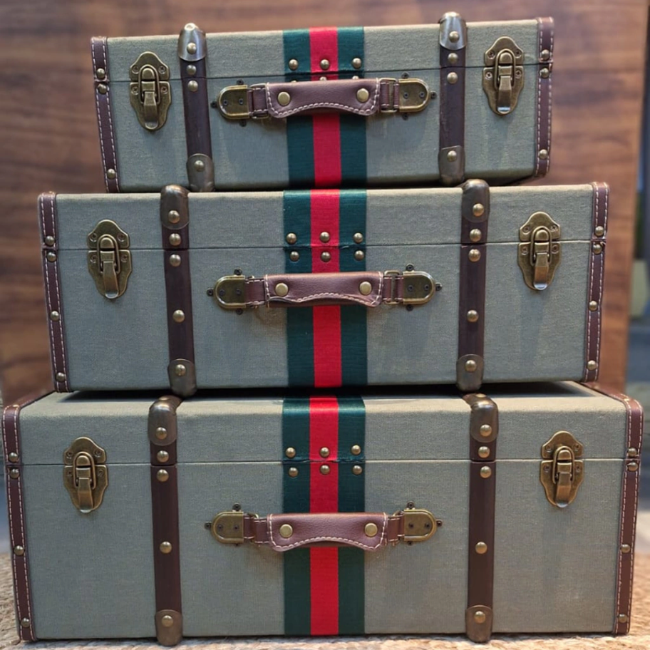 O grande destaque fica por conta das listras centrais em verde e vermelho, que remetem ao estilo retrô de luxo. Os baús podem ser empilhados ou usados separadamente, funcionando como organizadores, mesinhas laterais ou apenas como peças decorativas que impressionam.