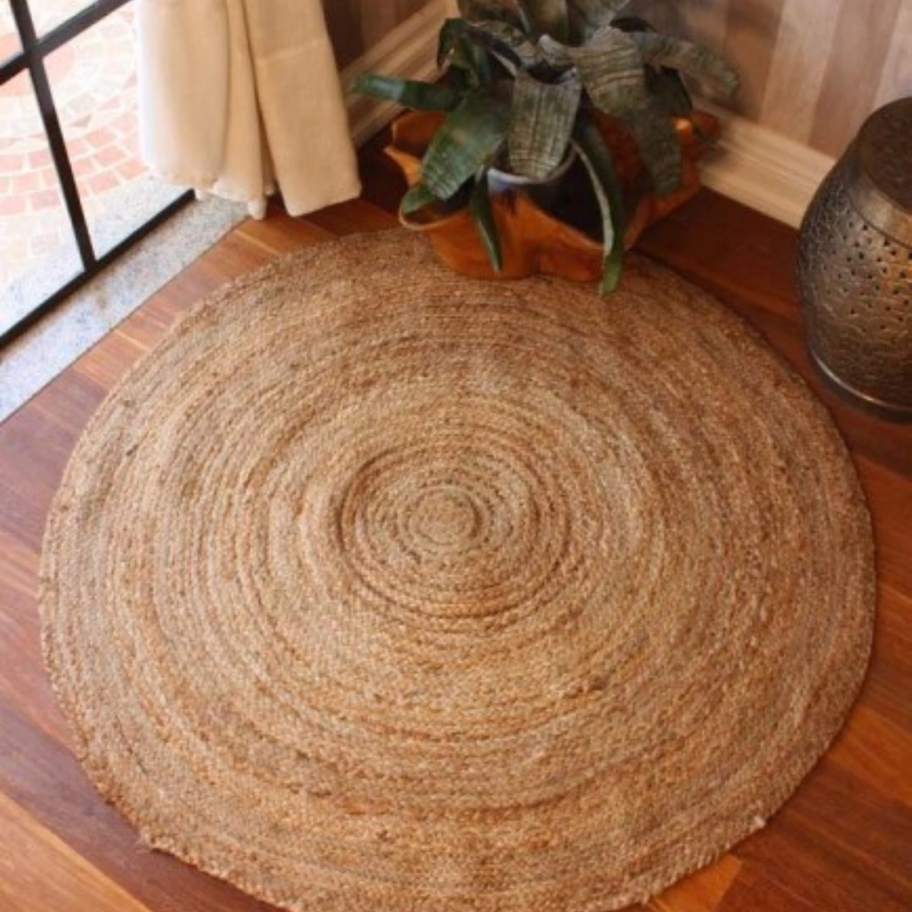 A estética simples do tapete redondo grande junto a cor natural da juta deixa a decoração do ambiente mais calorosa.